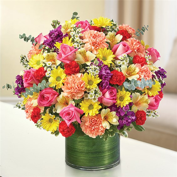 Express your condolences with our truly original sympathy arrangement of bright and beautiful roses, stock, alstroemeria, carnations and more. Designed by our florists to offer comfort to friends and family during difficult times of loss. Graceful, bright-toned arrangement of roses, stock, alstroemeria, carnations, daisy poms, mini carnations and monte casino, gathered with variegated pittosporum and spiral eucalyptus Hand-designed by our expert florists in a stylish clear glass cylinder vase wrapped with a Ti leaf ribbon; vase measures 6"H Appropriate for the service or the home of friends and family members Large arrangement measures approximately 16"H x 17"L Medium arrangement measures approximately 15"H x 16"L Small arrangement measures approximately 14"H X 15"L Our florists hand-design each arrangement, so colors, varieties, and vase may vary due to local availability