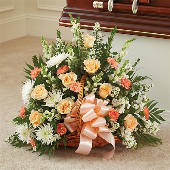 They drew people in with their warm smile and exuberant spirit. These are the qualities we remember most, the ones we want to honor. Our fireside basket arrangement, hand-designed by expert florists with a splay of peach, orange and white blooms, captures this thoughtful sentiment in a grand display, beautifully suited for the funeral or gravesite.